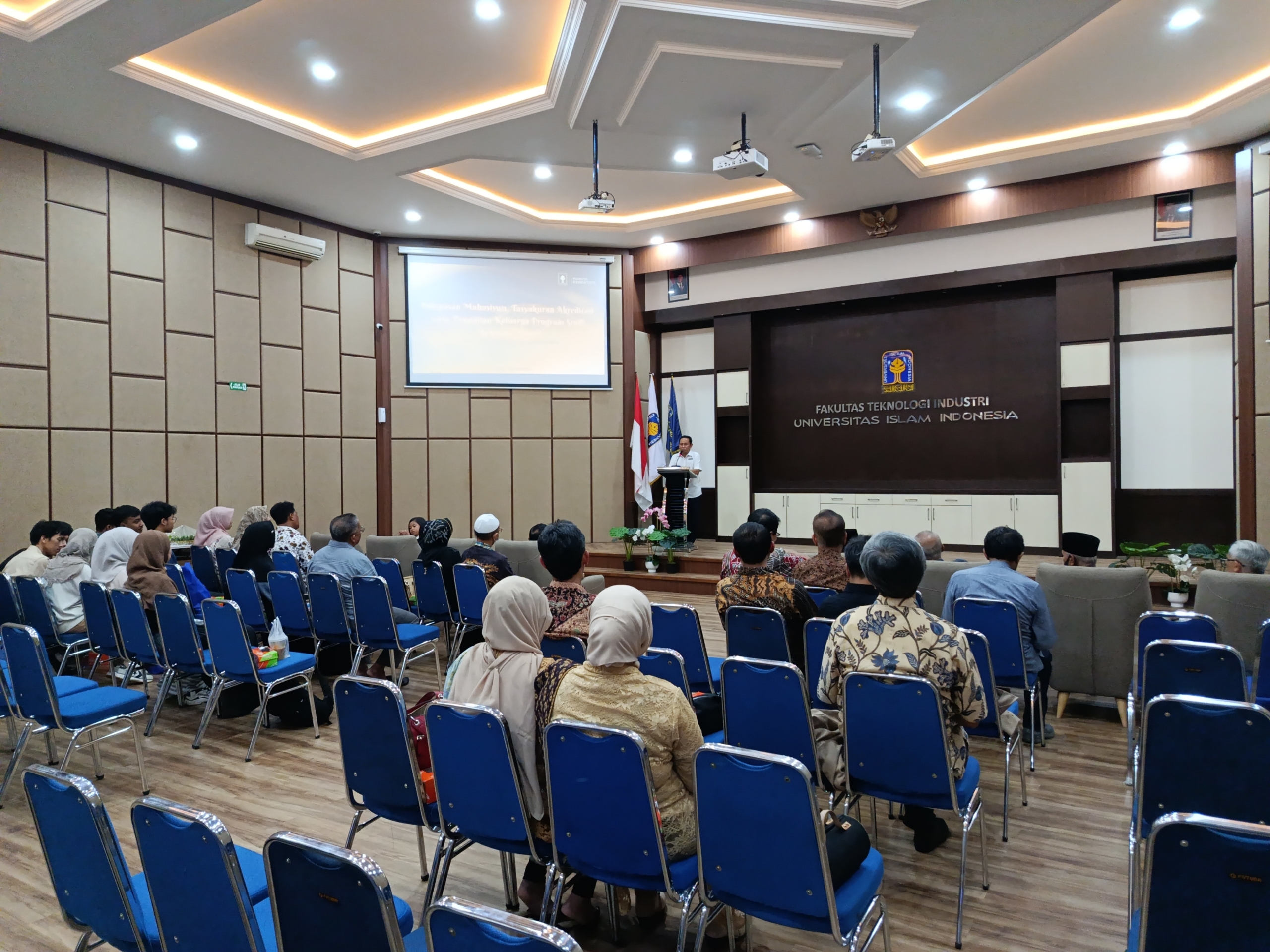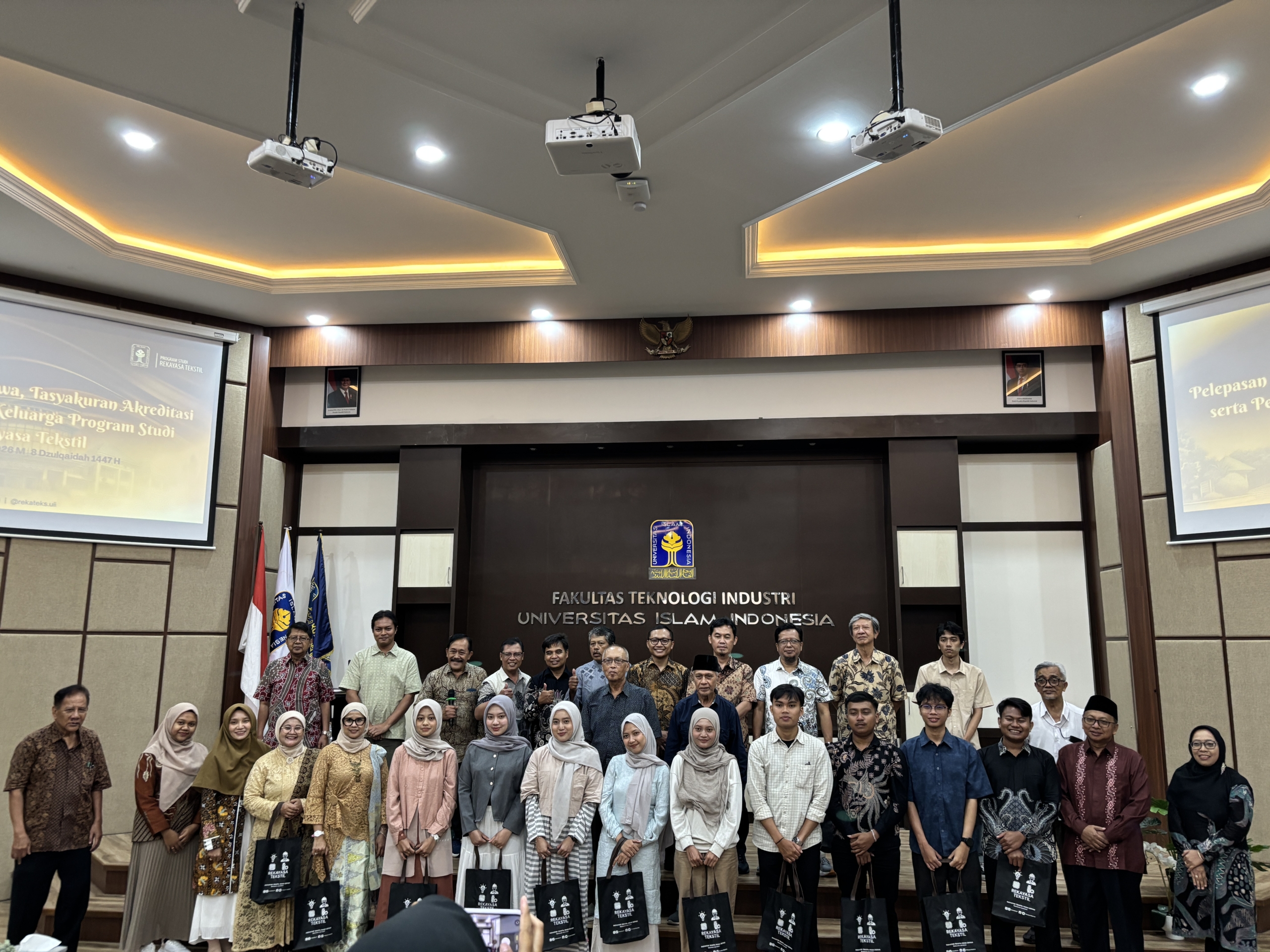 Program Studi S1 Rekayasa Tekstil FTI UII melangsungkan kegiatan pengajian sebagai penutup rangkaian acara tasyakuran akreditasi dan pelepasan wisuda, yang dihadiri oleh pimpinan, dosen, tenaga kependidikan, mahasiswa, lulusan, serta orang tua/wali. Kegiatan berlangsung pada Sabtu, 25 April 2026, jam 15.30 WIB hingga 16.00 WIB, di Auditorium FTI UII. Dalam suasana yang khidmat dan penuh kebahagiaan, pengajian menjadi momentum refleksi bersama atas nikmat yang telah diraih sekaligus pengingat akan amanah yang harus dijaga ke depan.